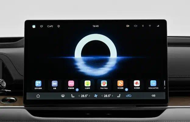 铂智7中控台采用的是一种极简豪华的布局,我可以看到8.8英寸全液晶仪表+15.6英寸2K悬浮中控屏+27英寸全景HUD抬头显示,这三个屏幕就会联动在一起,确实是很有科技感的,以后在开车时不需要低头就能看到导航驾驶状态,还有车速。先来看一下用料,真的是很用心,方向盘是真皮的材质,还有真木的装饰板,顶棚还有仿麂皮的材质。一点都没有廉价的塑料感,进入到车内就会觉得有满满的豪华氛围。中控屏的下面还会有空调以及音量的实体按键,在实现盲操时确实比较方便。车机系统就是华为鸿蒙座舱5.0,操作的流畅度就好像是高端的平板一样。在滑动还有切换APP时,确实比较迅速,没有任何的卡顿感。